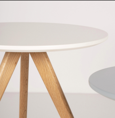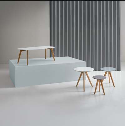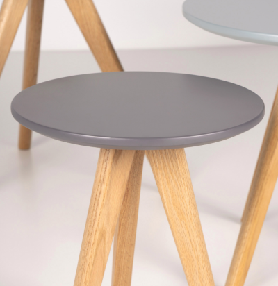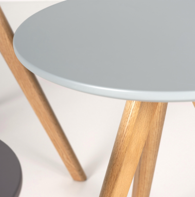 Cada mesa presenta un tablero redondo de diferente tamaño, fabricado en DM lacado en tonos blanco, azul y gris, lo que confiere al conjunto un aire moderno y versátil.